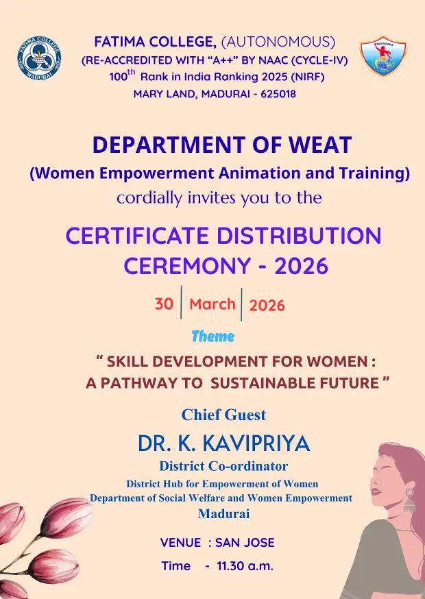 WEAT (Women Empowerment Animation & Training Programme) programme of Fatima College started in the year 2004 with its vision to empower women through education & training.