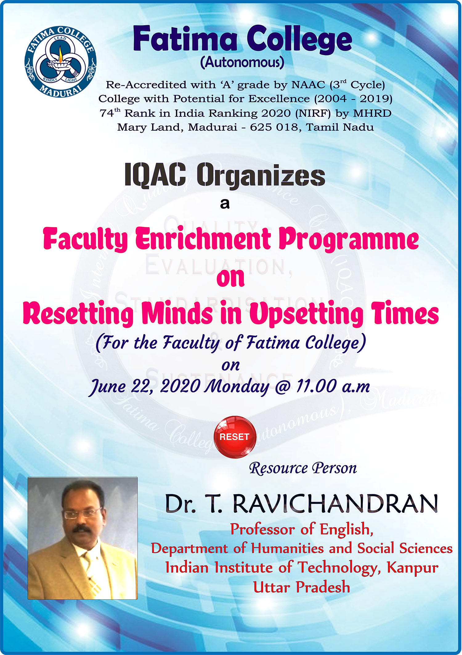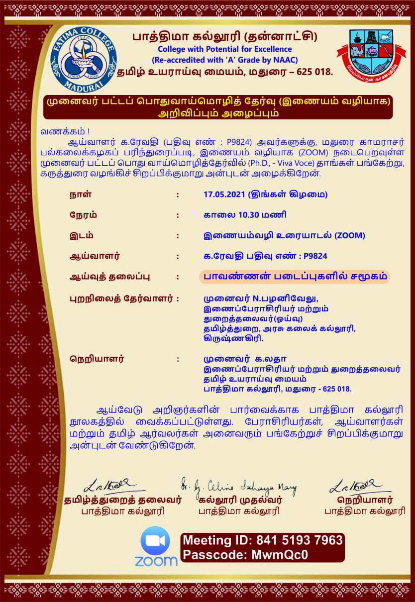 | Ph.D. Viva: Invitation & Synopsis of Ms. G. Revathi, The Research Centre of Tamil on May 17, 2021. |