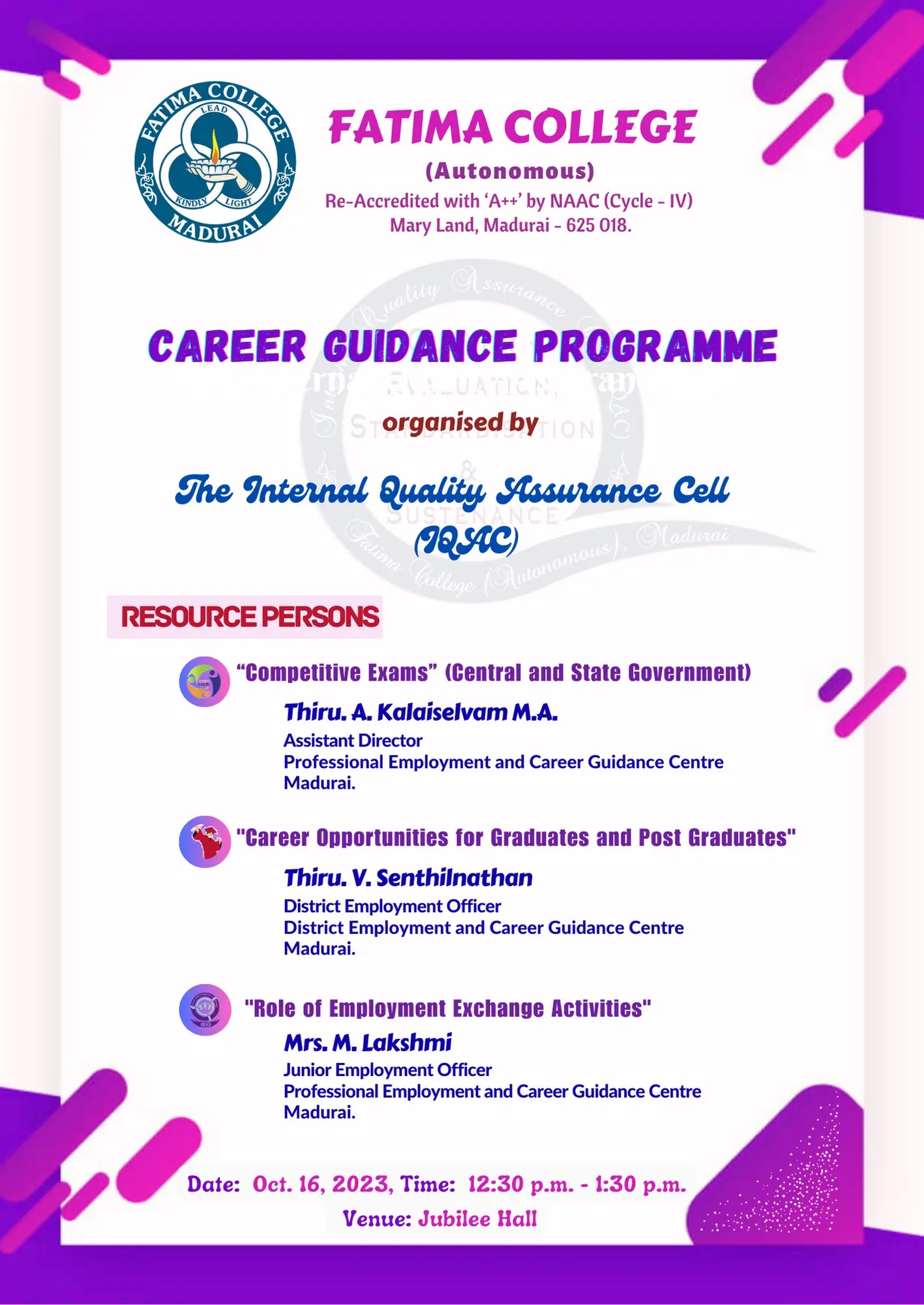 PG Entrance Test will be conducted in the College Campus on May 13, 2024 at 9:15 a.m. for the following Programmes: M.A. Economics, M.A. English, M.A. Tamil, M.Sc. Physics & M.Com. |