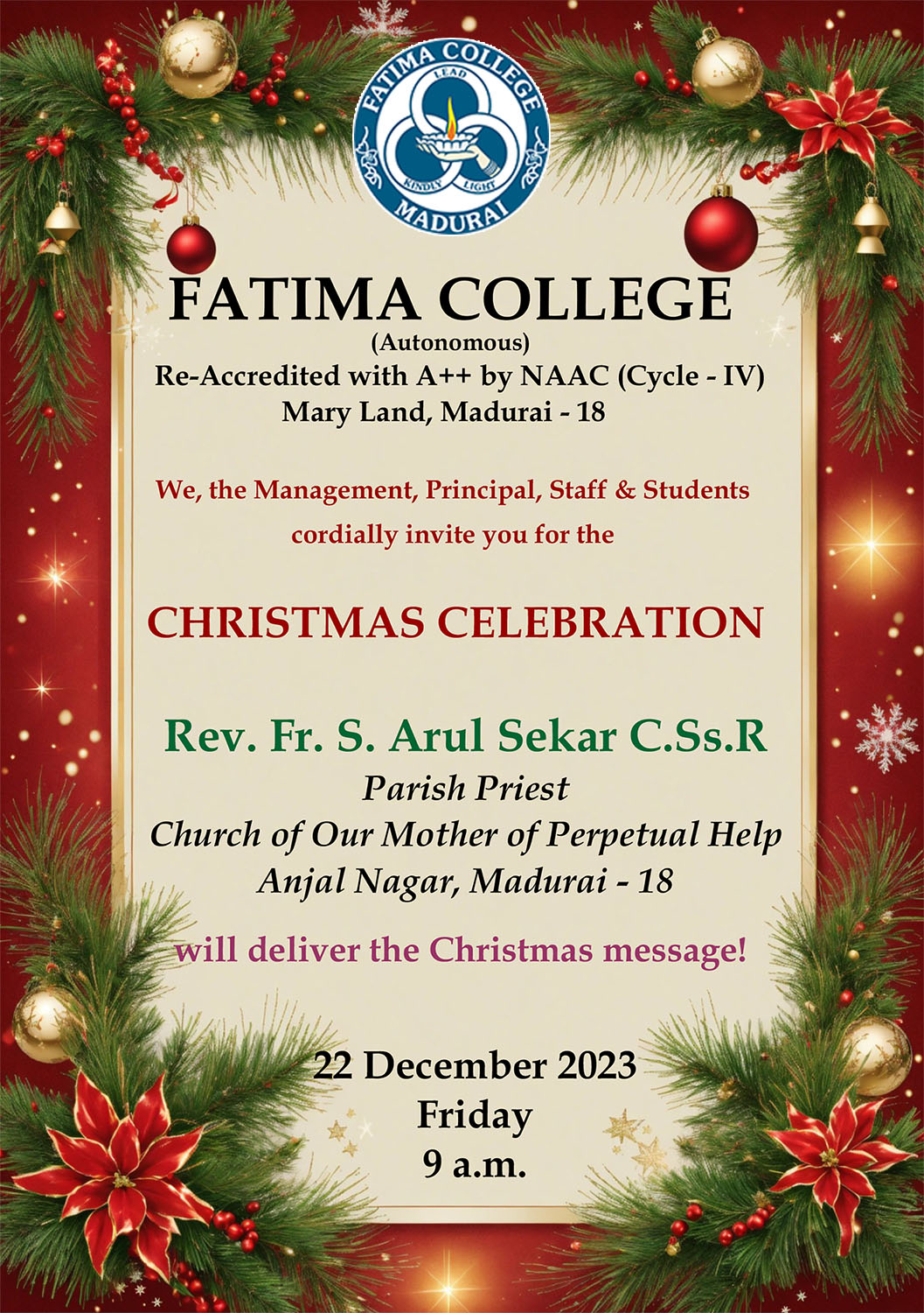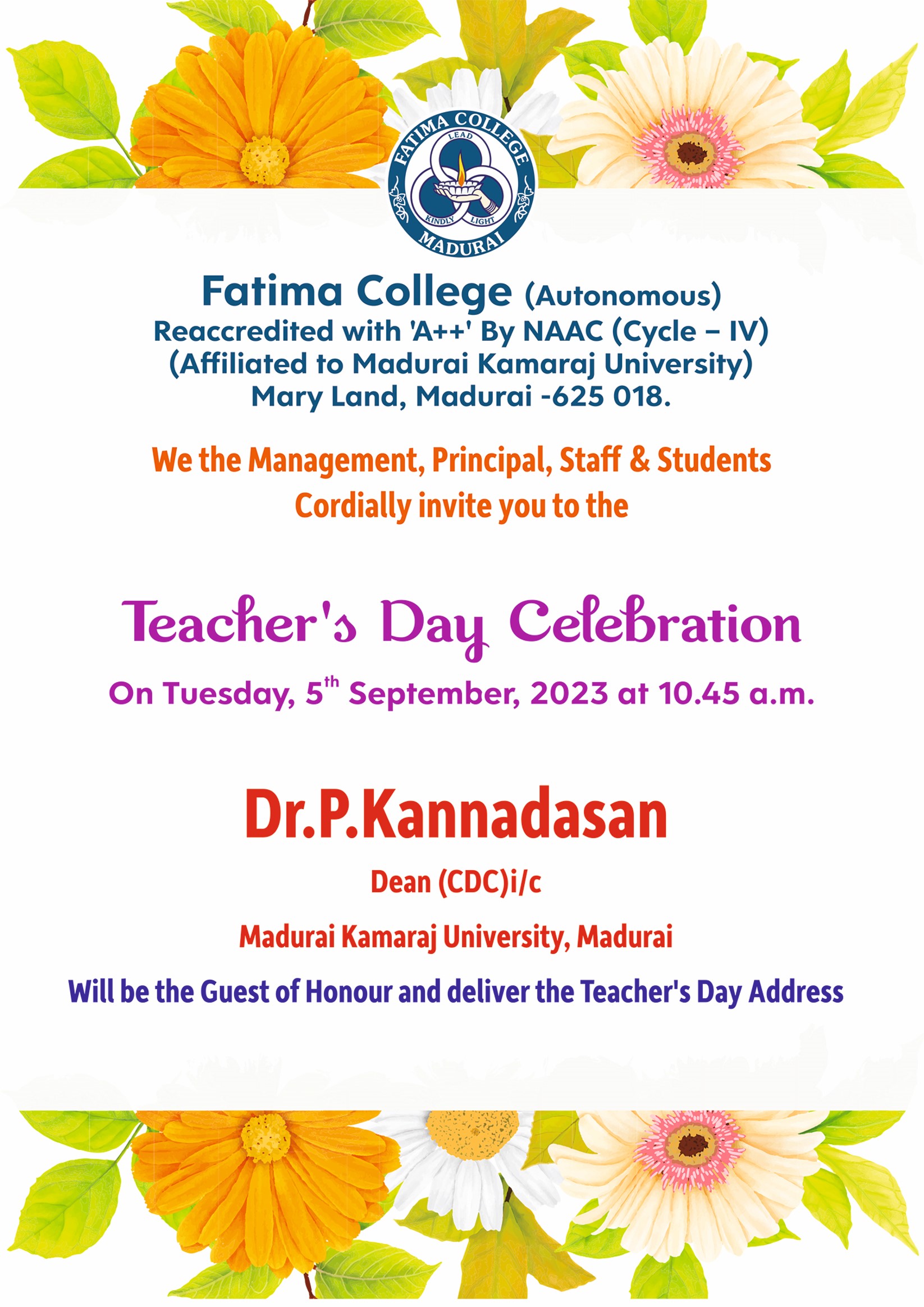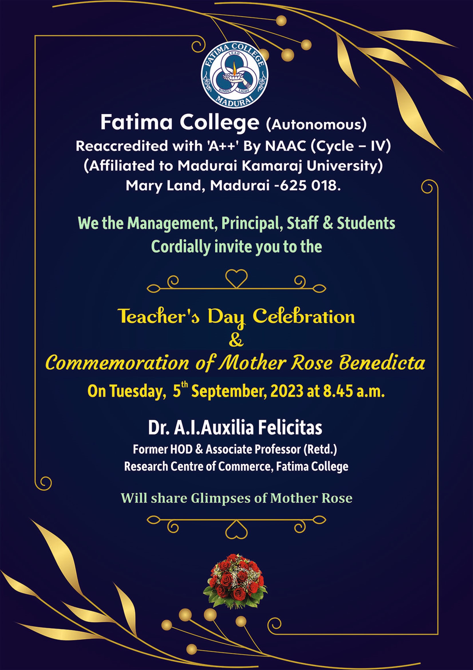 | Invitation: Teacher’s Day Celebration & Commemoration of Mother Rose Benedicta on Sep. 05, 2023. |