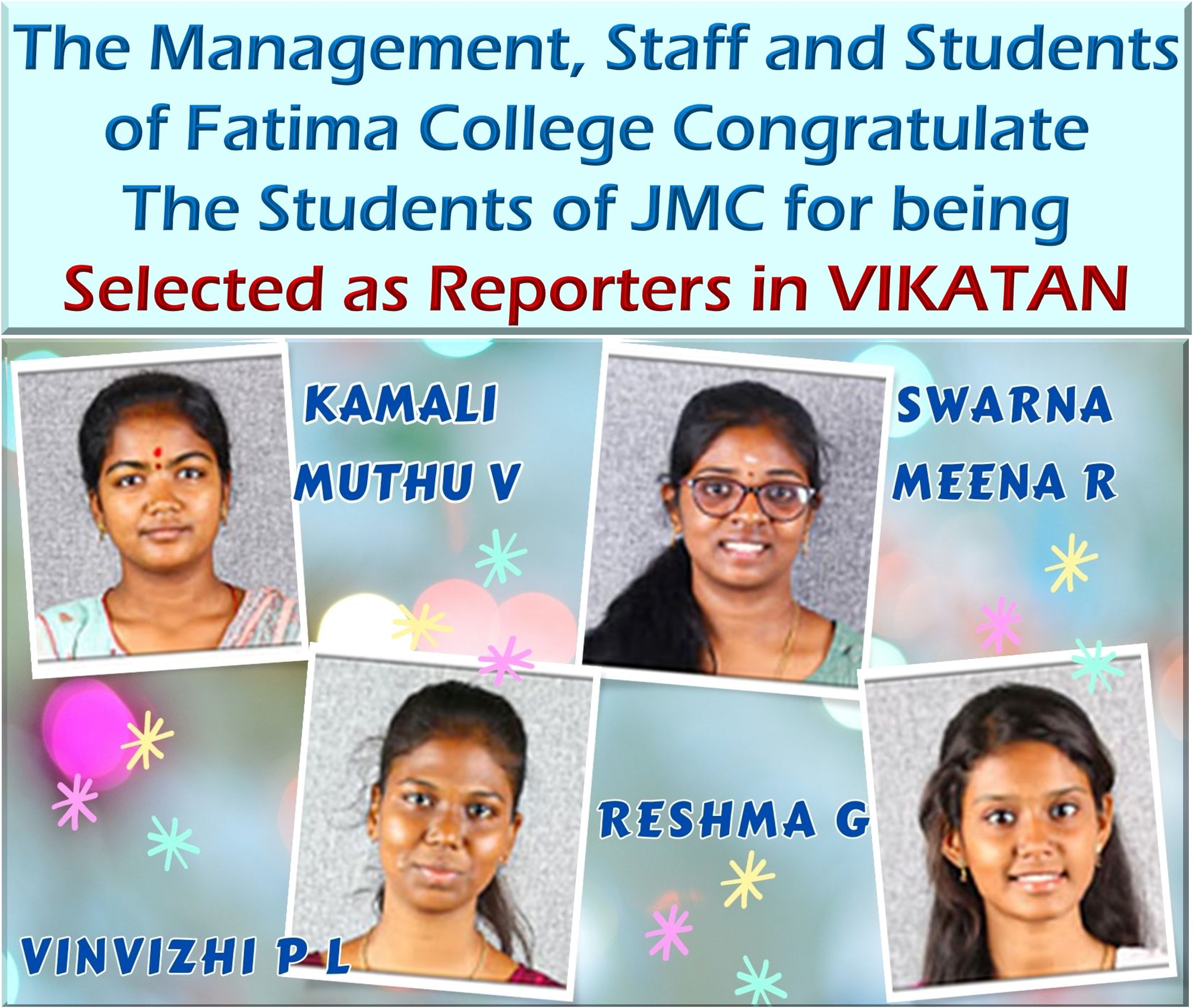 | Congratulations! the Students of JMC for being selected as Reporters in VIKATAN. |
