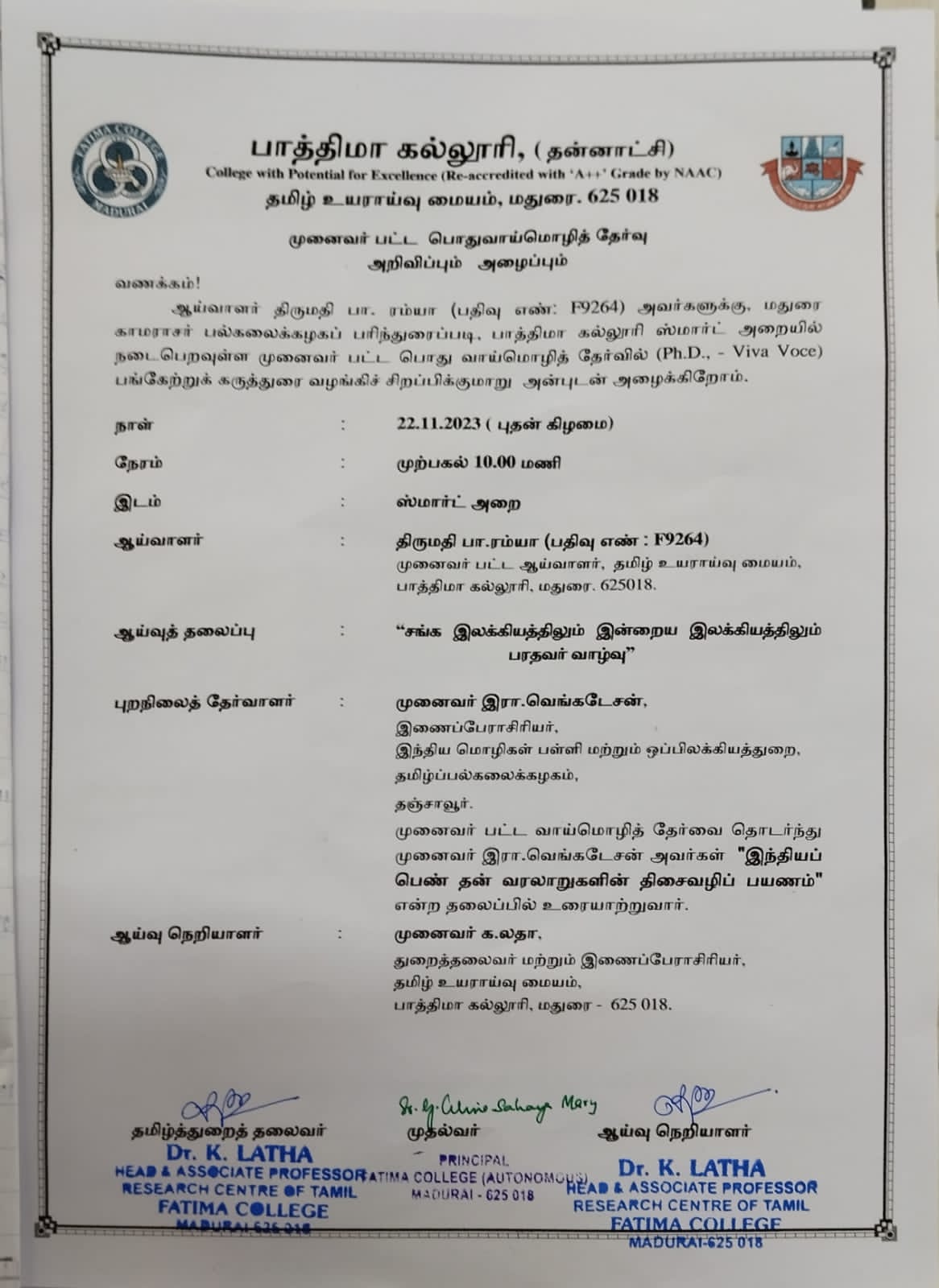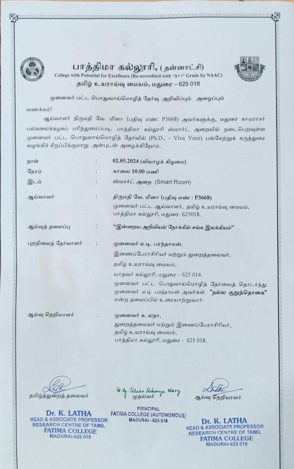 | Ph.D. Viva Voce: Ms. V. Meena (Reg. No.: P3668), The Research Centre of Tamil on May 02, 2024. |