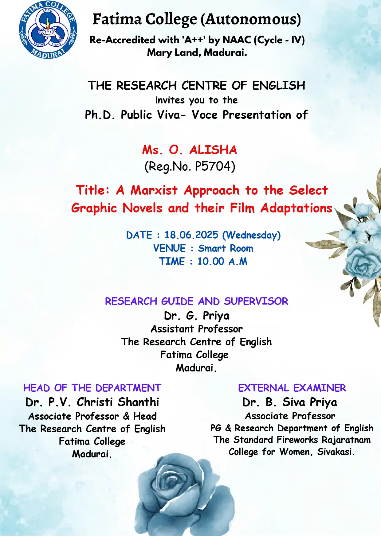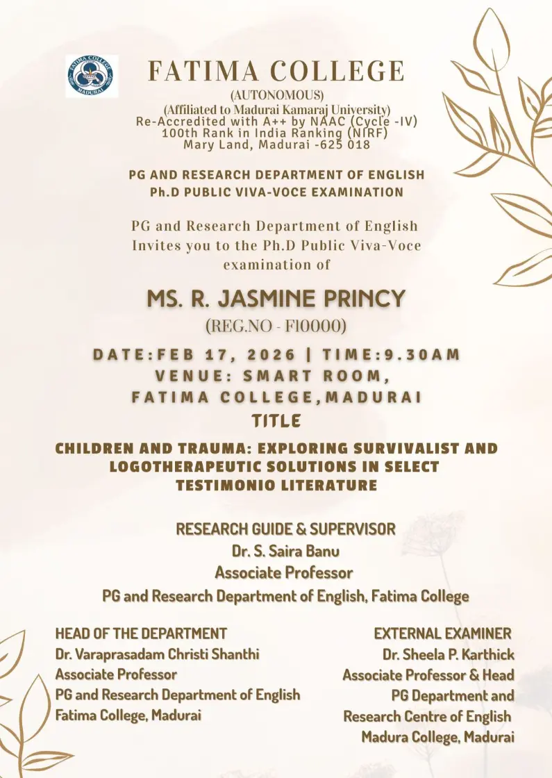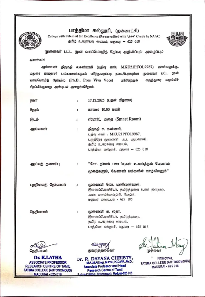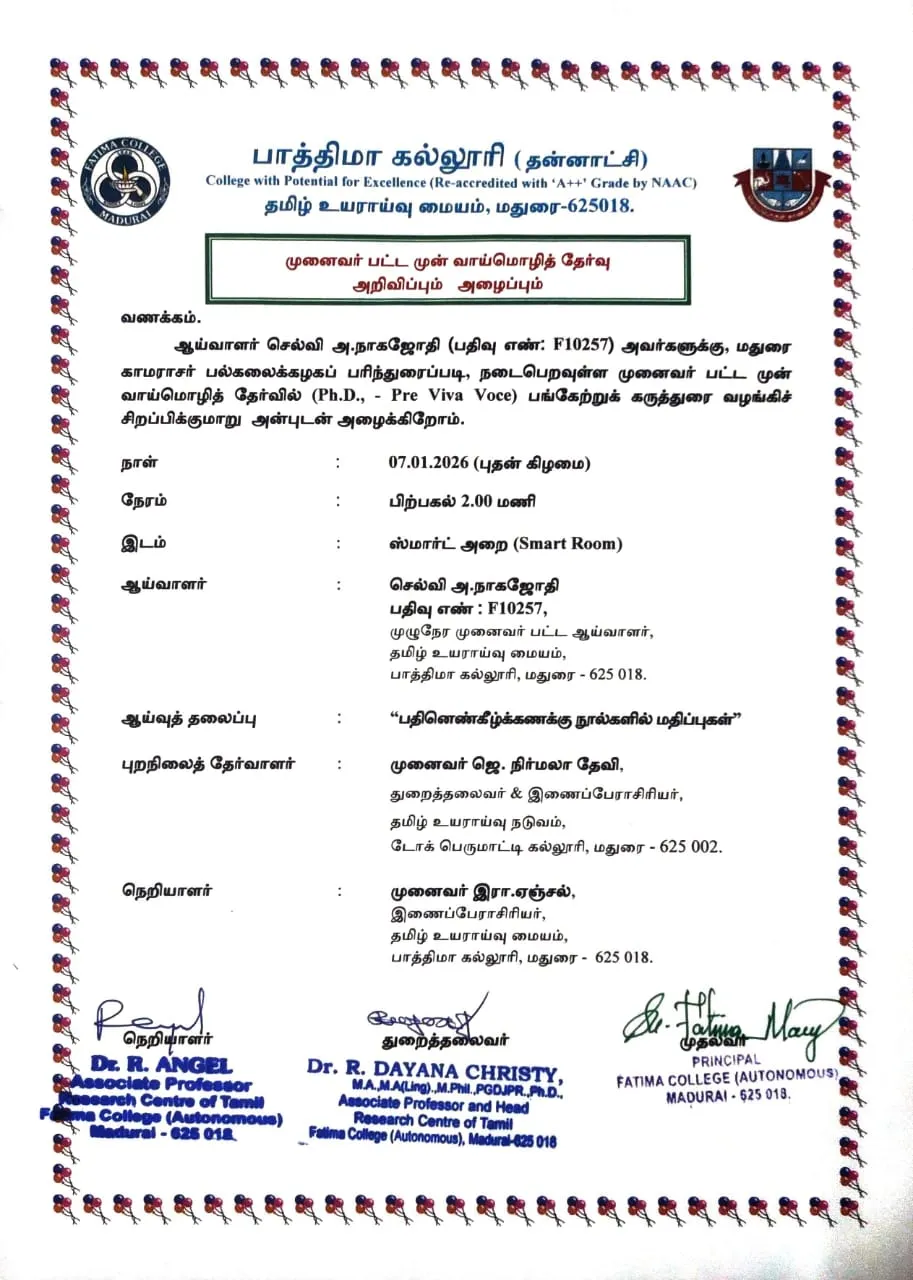 Ph.D. Viva Voce: Ms. O. Alisha (Reg. No. P5704), The Research Centre of English on June 18, 2025. |