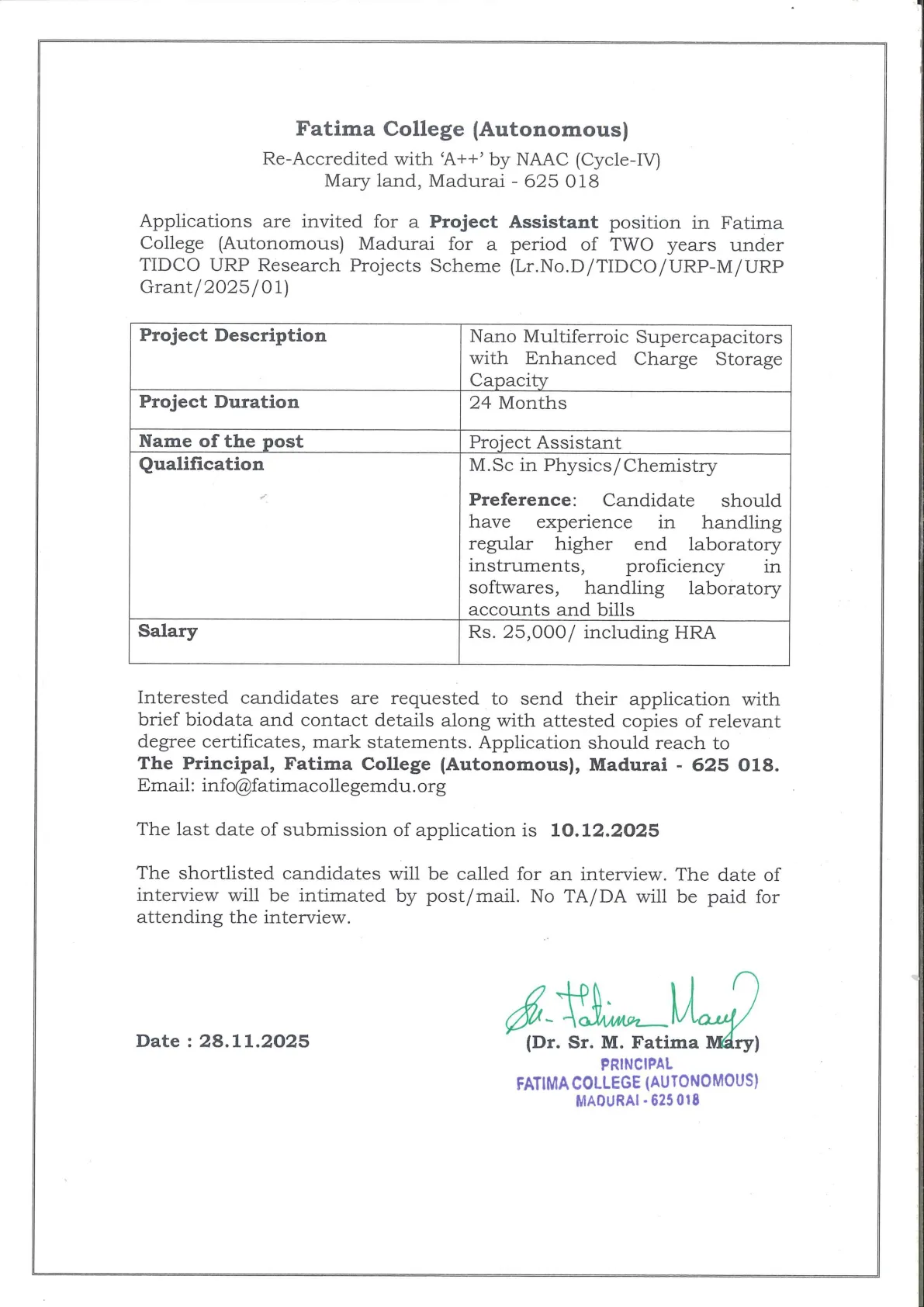 | Fatima College proudly announces the sanctioning of two TIDCO (Tamil Nadu Industrial Development Corporation) Projects – an Institute–Industry initiative under the University Research Park – on Dec. 06, 2025.. |