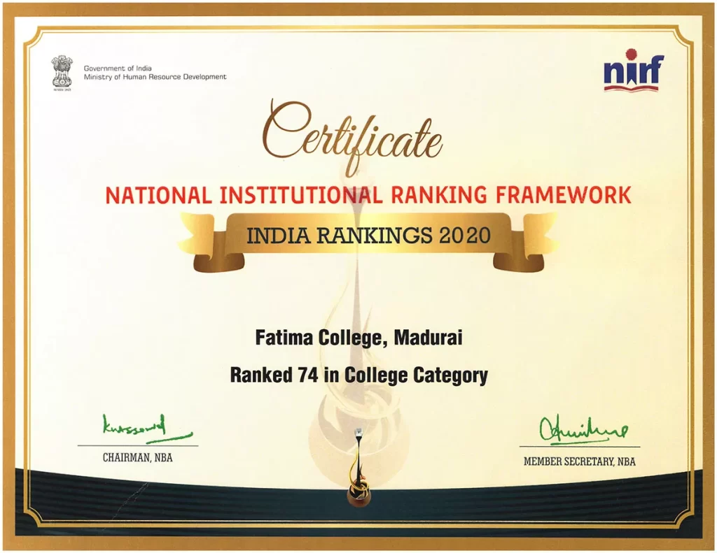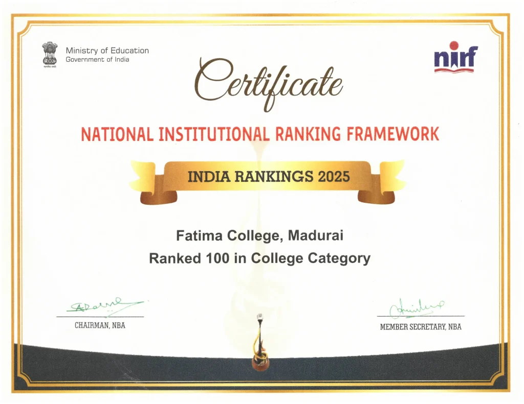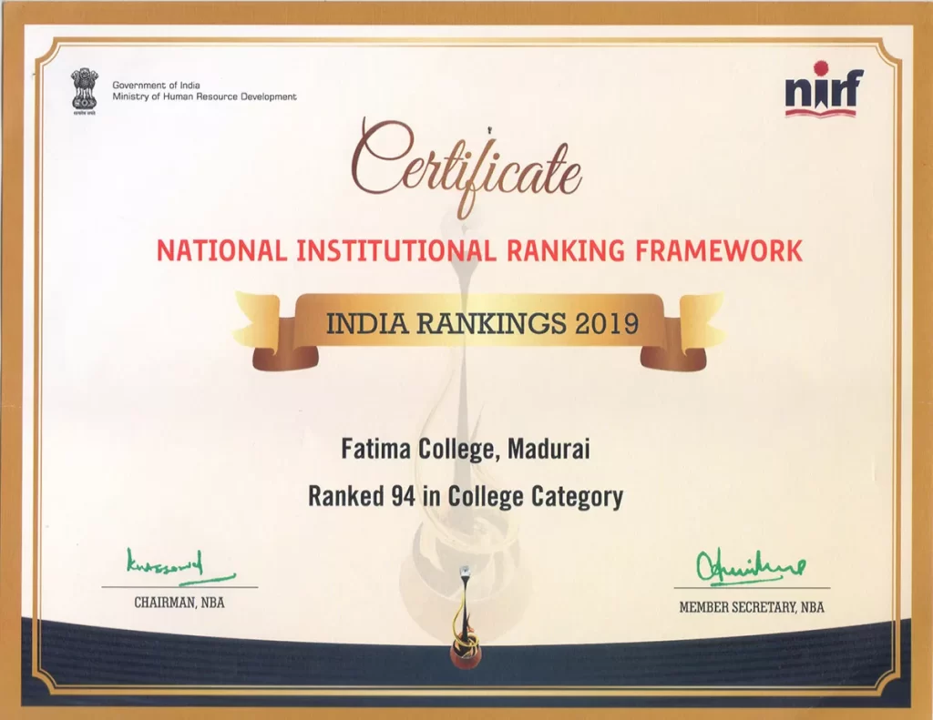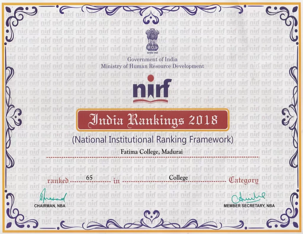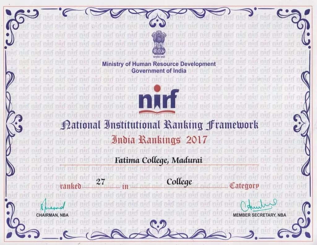NIRF NATIONAL INSTITUTIONAL RANKING FRAMEWORK (NIRF) Composition of the IQAC Master Plan & Action Taken Best Practices Institutional Distinctiveness UGC Undertaking Utilization Maintenance Policies NAAC Certificates NIRF Annual Quality Assurance Report Capacity Development & Skills Enhancement Activities IQAC Minutes Feedback MoUs & Linkages Fatima Resource Team (FRT) Newsletter / E-Bulletin Current Report NIRF 2025 Details  Archives NIRF 2024 DetailsNIRF 2023 DetailsNIRF 2022 DetailsNIRF 2021 DetailsNIRF 2020 DetailsNIRF 2019 DetailsNIRF 2018 DetailsNIRF 2017 DetailsNIRF 2016 Details CERTIFICATES NIRF 2025 NIRF 2020 NIRF 2019 NIRF 2018 NIRF 2017